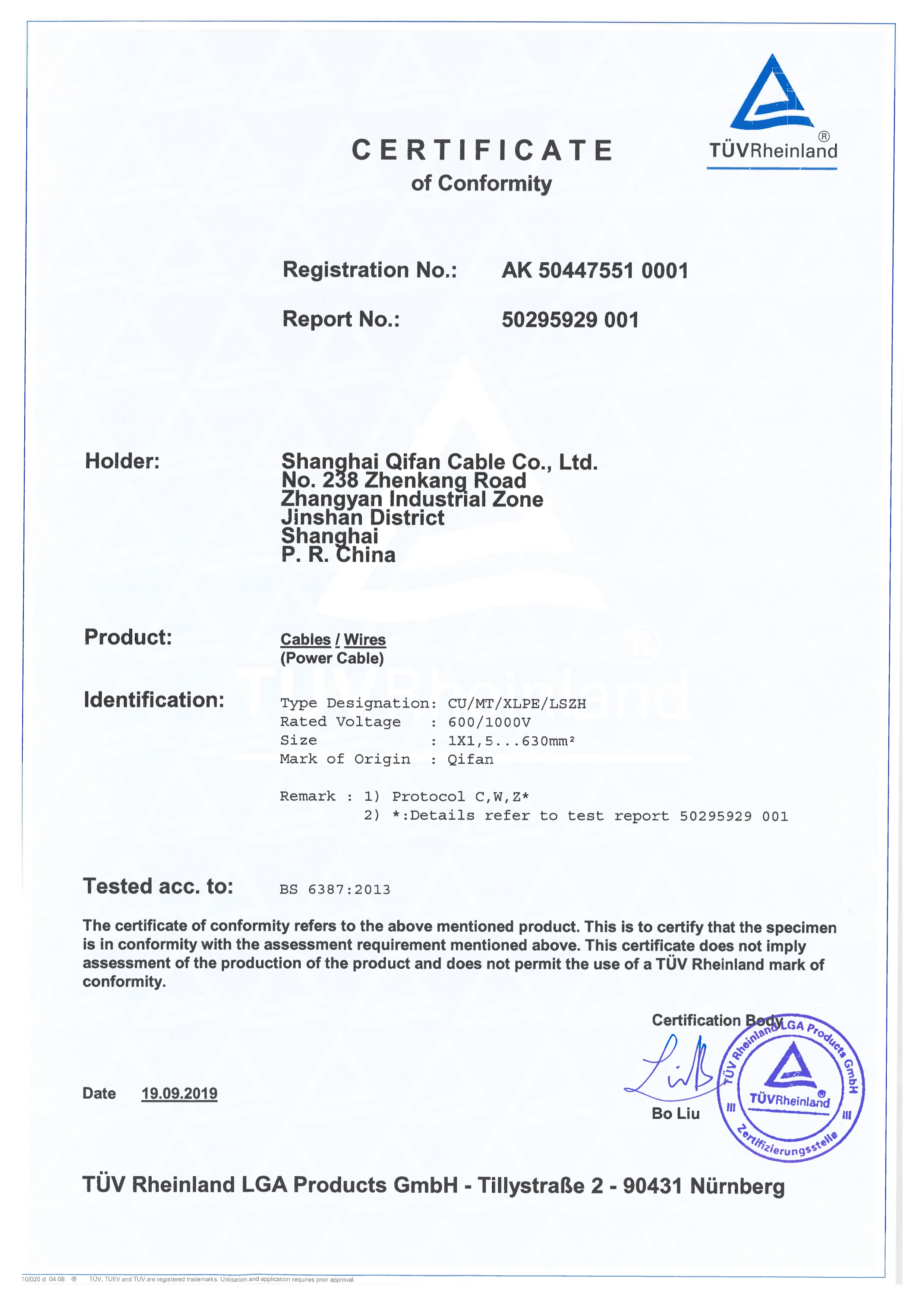 BS6387 (CWZ) CU/MT/XLPE/LSZH 1x1.5~630mm2